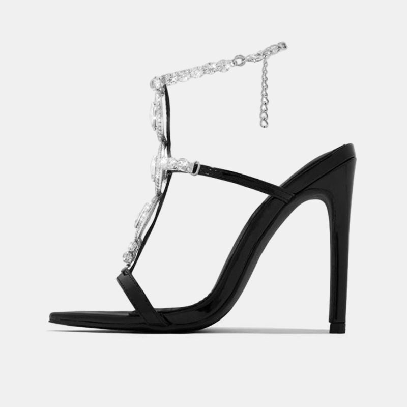 Step into style with the Primula Rhinestone Stiletto Sandals. These stunning sandals feature sparkling rhinestones. a chic pointed and open toe design. and sky-high stiletto heels. Made of high-quality PU material. these sandals are perfect for special occasions or adding a touch of glamour to any outfit. Elevate your look with these must-have stilettos.