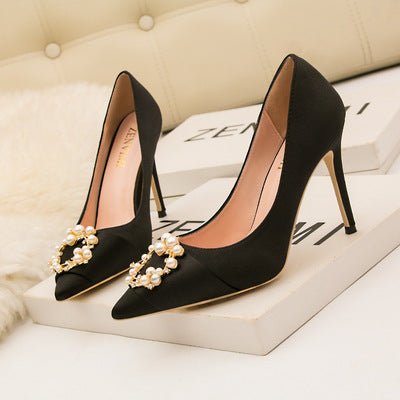 Elegant Pointed Toe Pearl Bow Knot Soft Silk Shallow High Heels