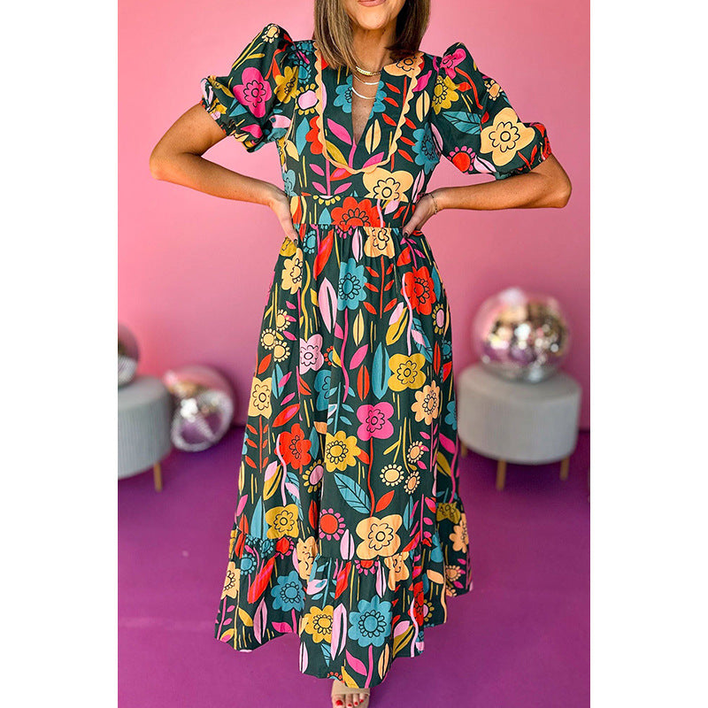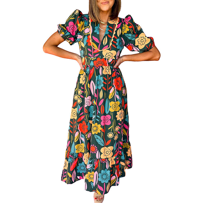 - This long dress exudes a charming retro vibe with its delicate floral print and elegant silhouette