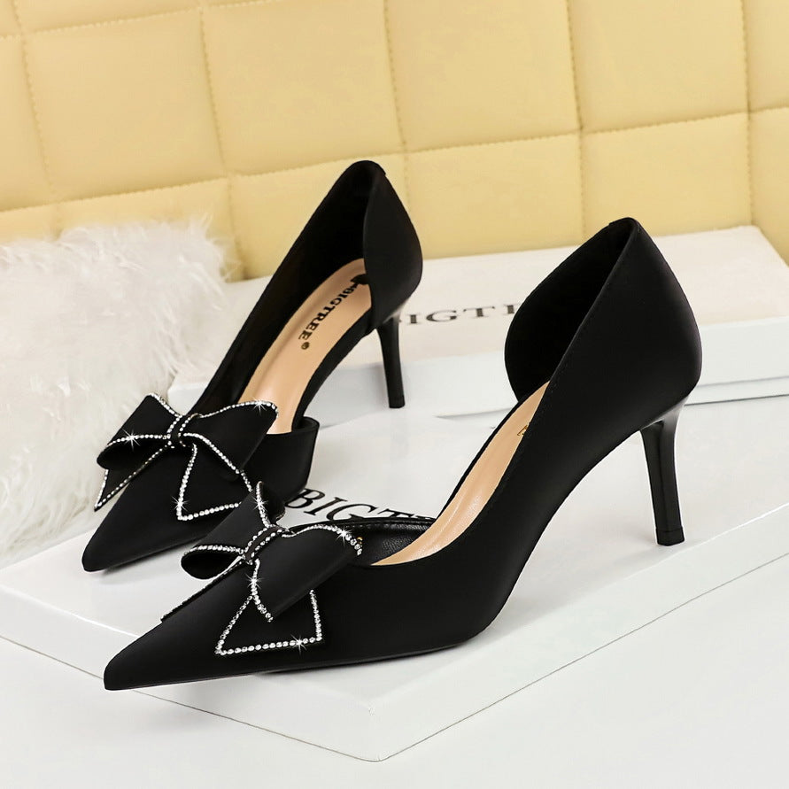 Popular elements: Korean version fashion wedding shoes side cutouts rhinestone bows pedicures slimming wedding shoes red shoes