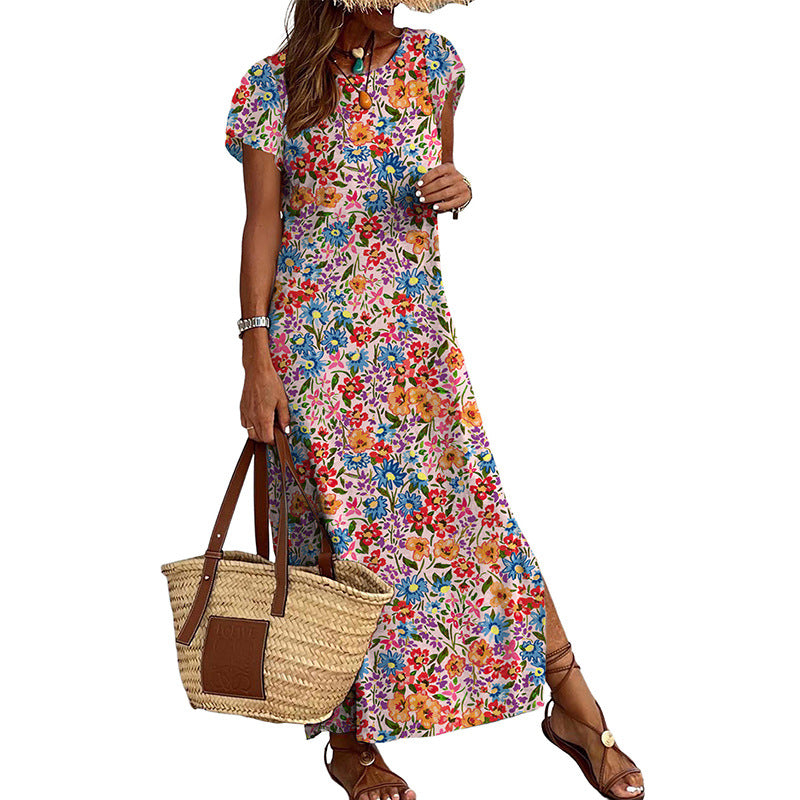 Multicolor Long Floral Print Short Sleeve Holiday Dress