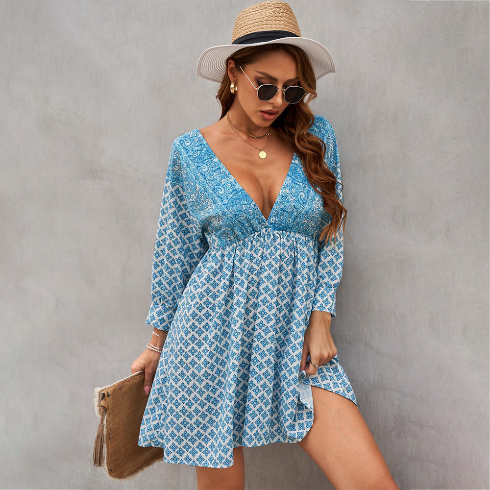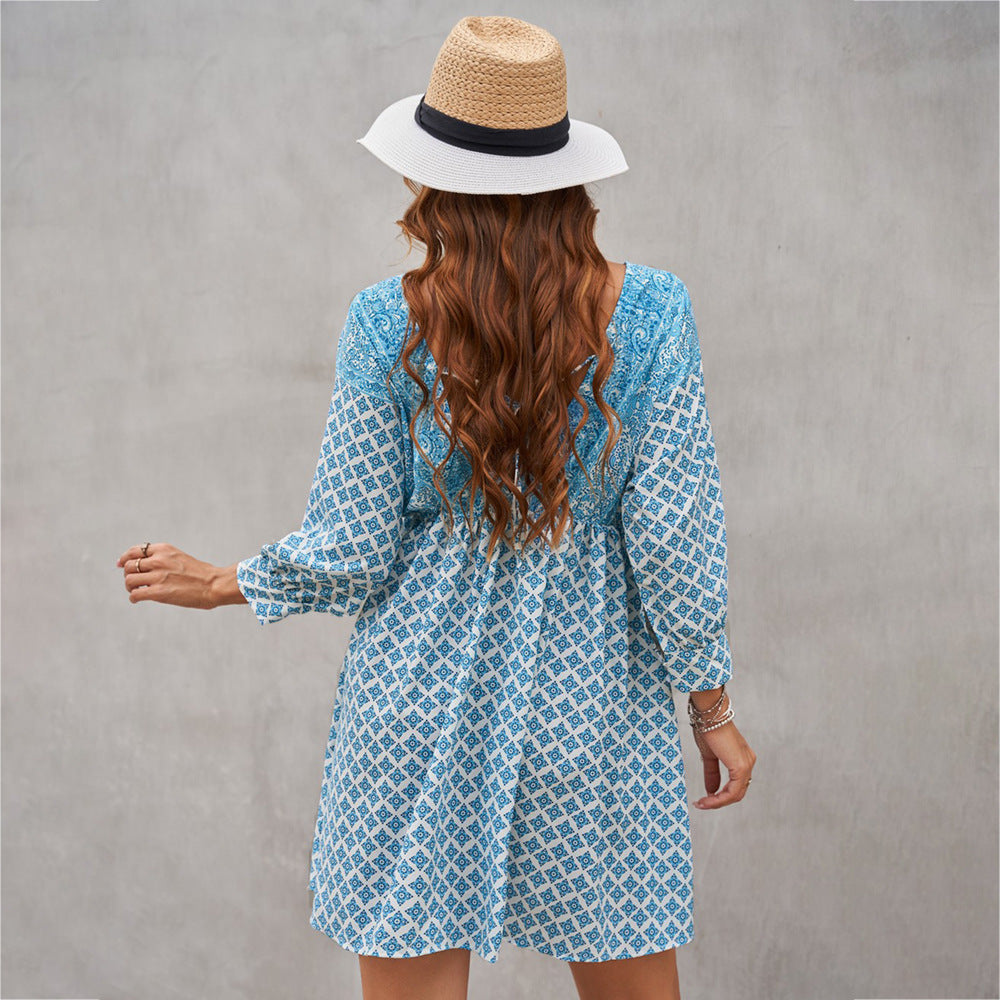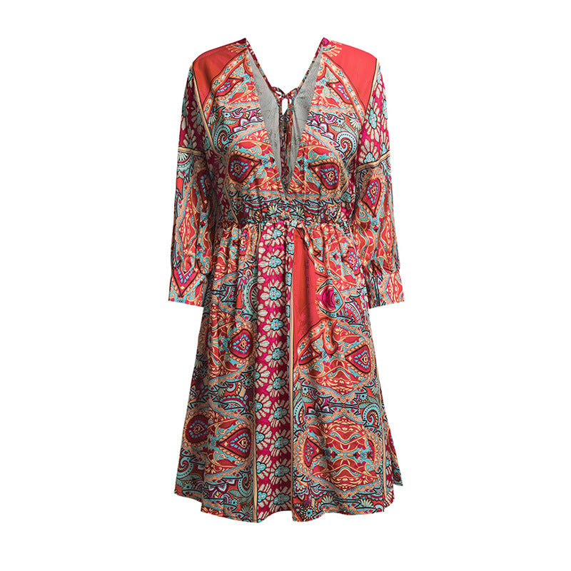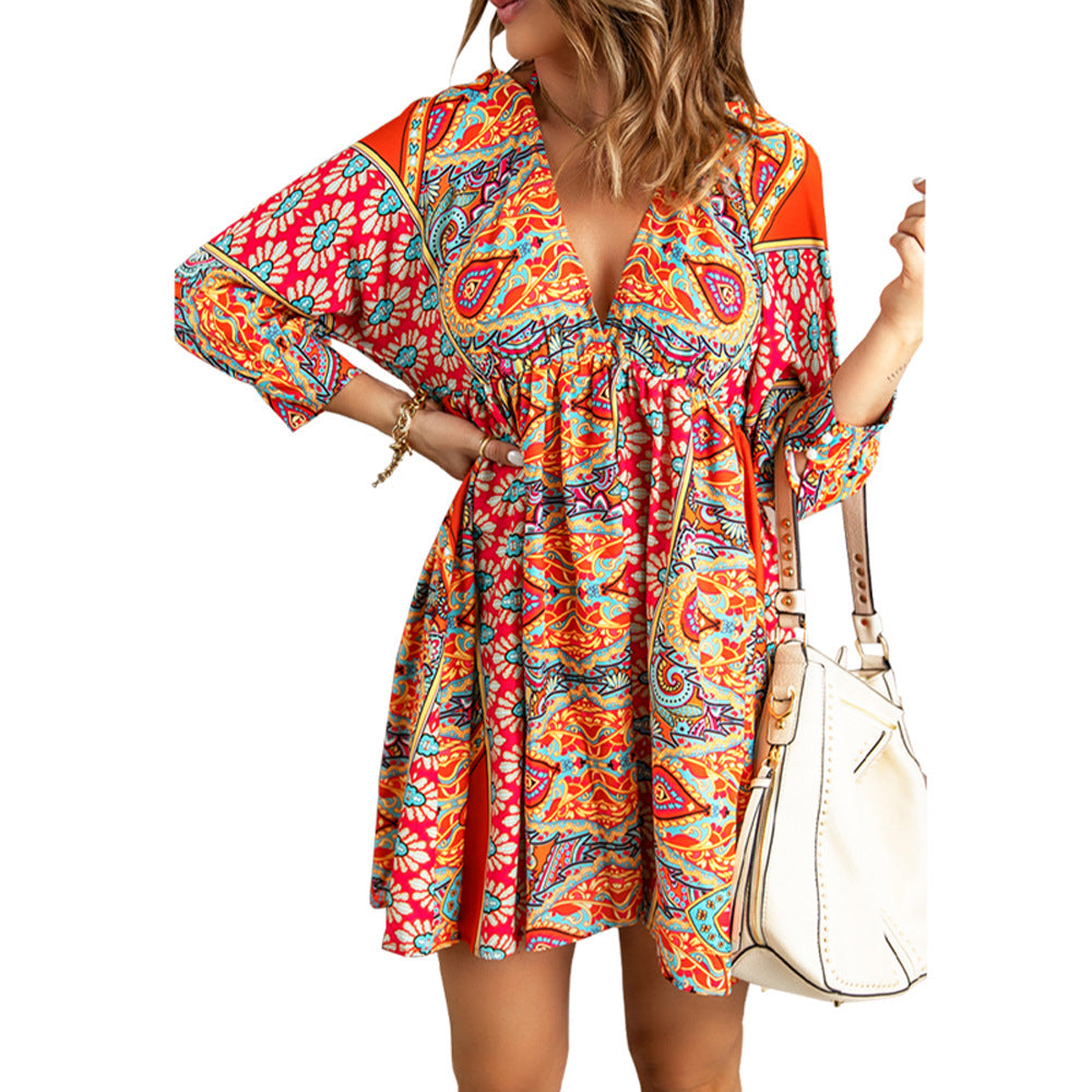 Multicolour V Neck 3/4 Sleeve Bohemian Vintage Print Mini Dress