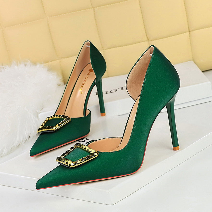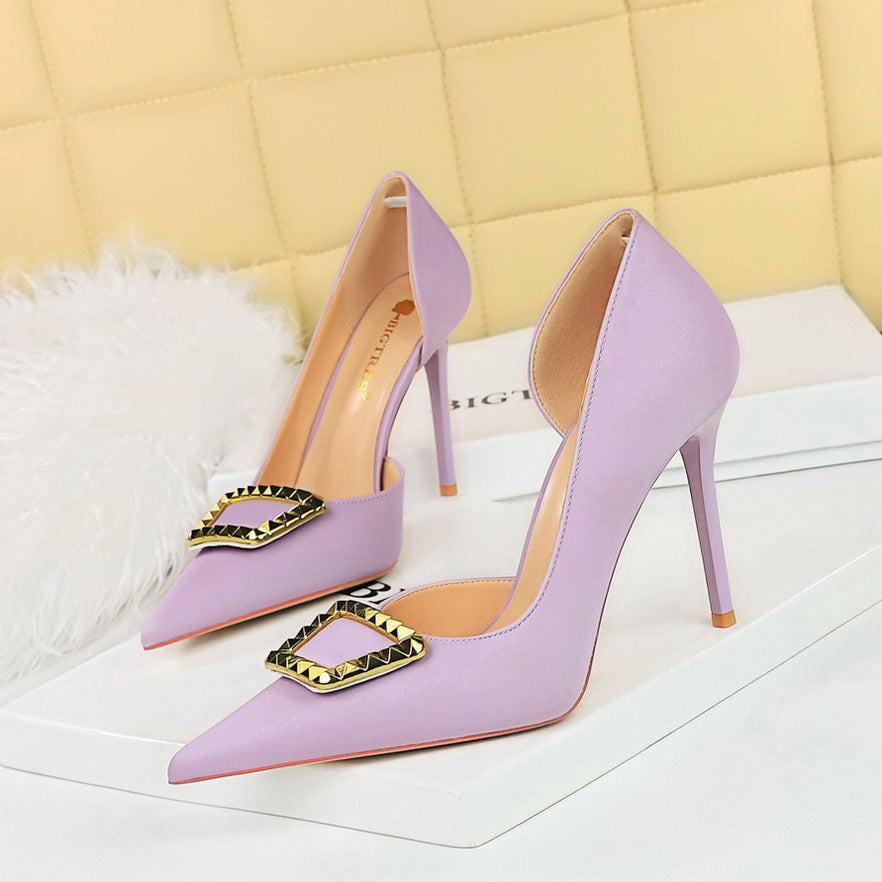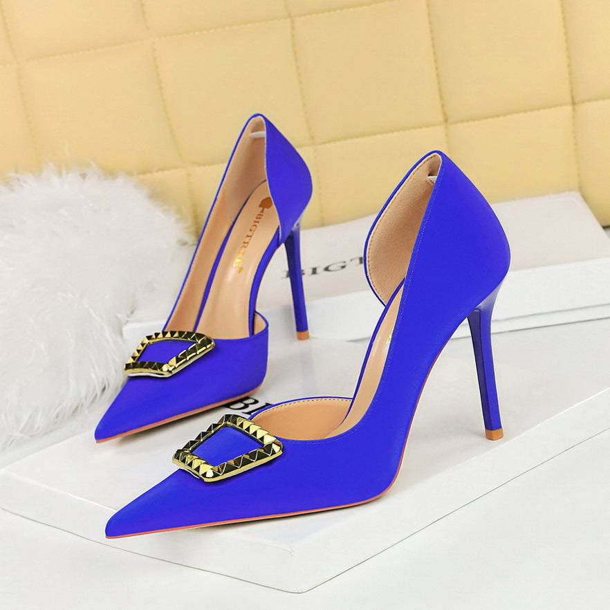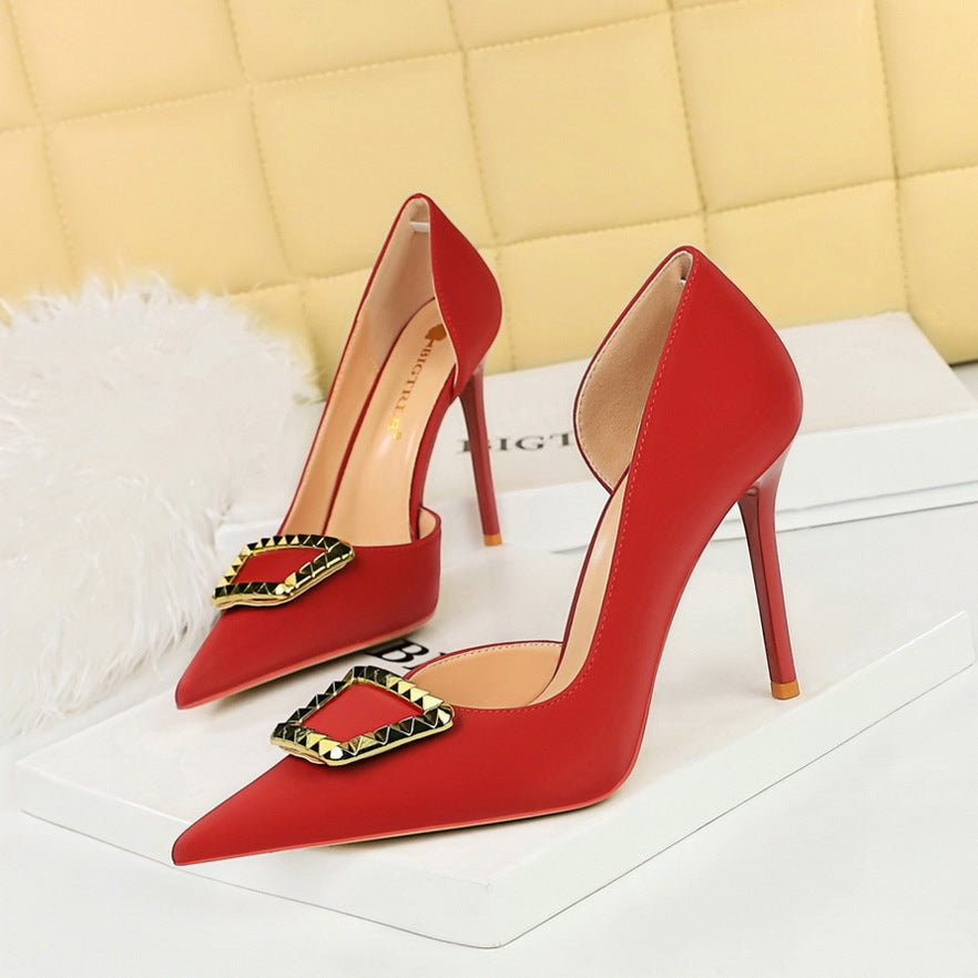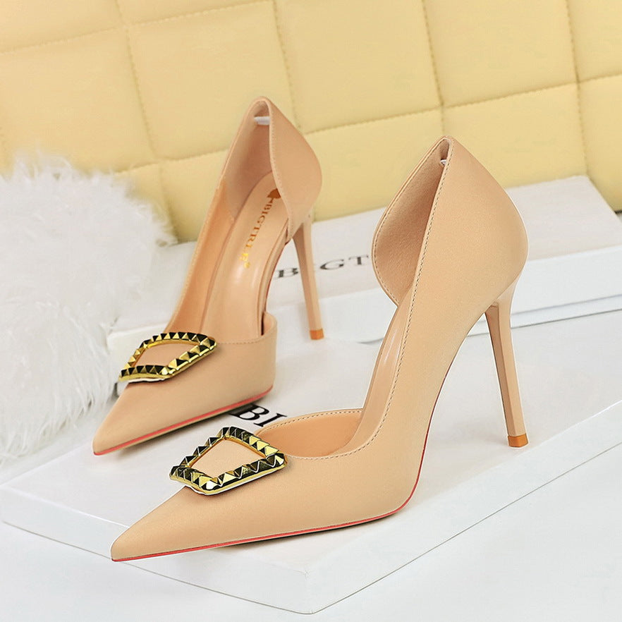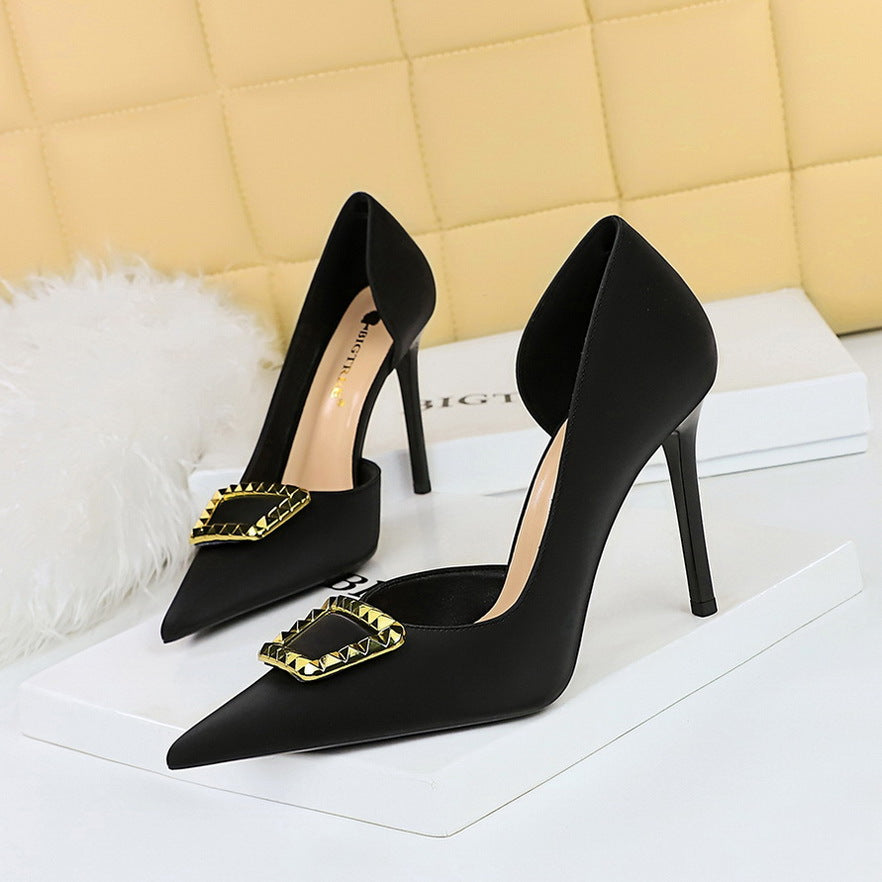 Popular elements: European and American fashion, sexy nightclubs, slimming banquets, thin heels, ultra-high heels, side hollowed out metal buckles, metal rivet buckles
