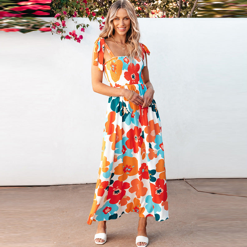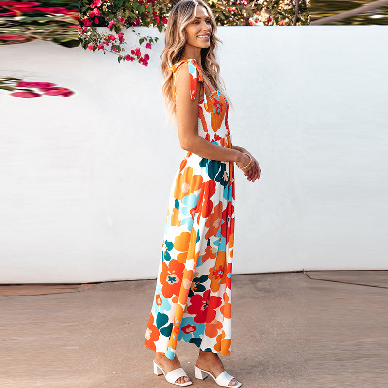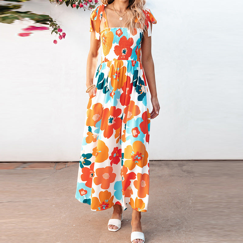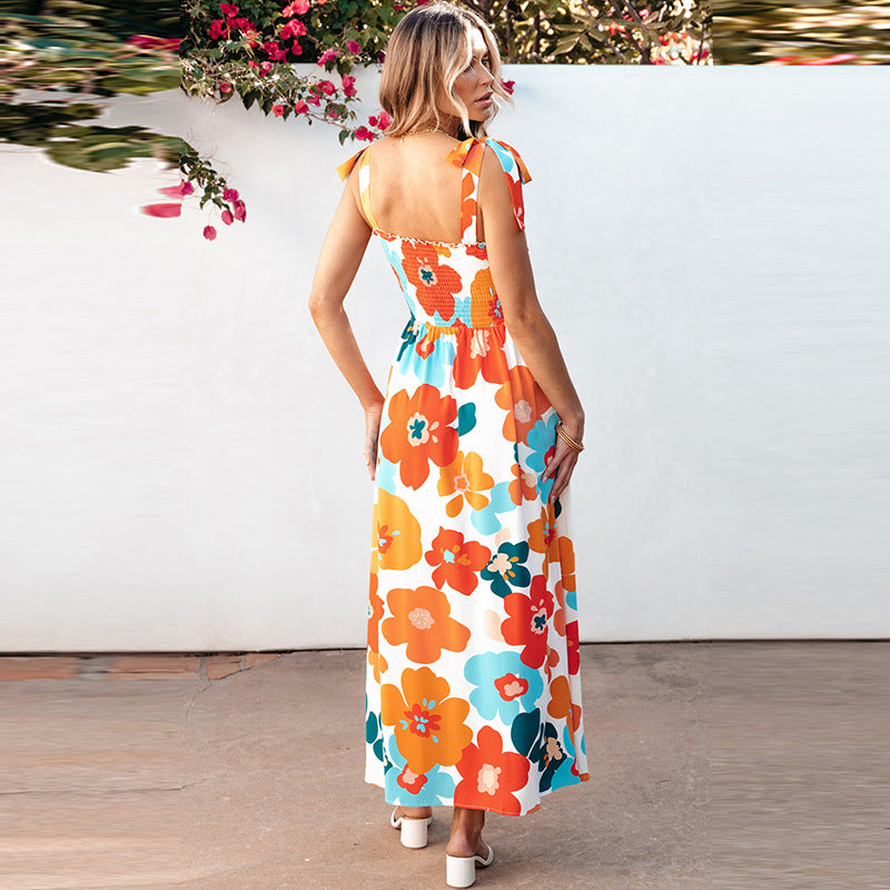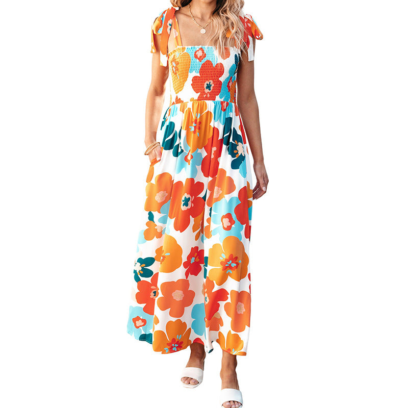 Orange Floral Self Tied Straps Smocked Bust Maxi Dress