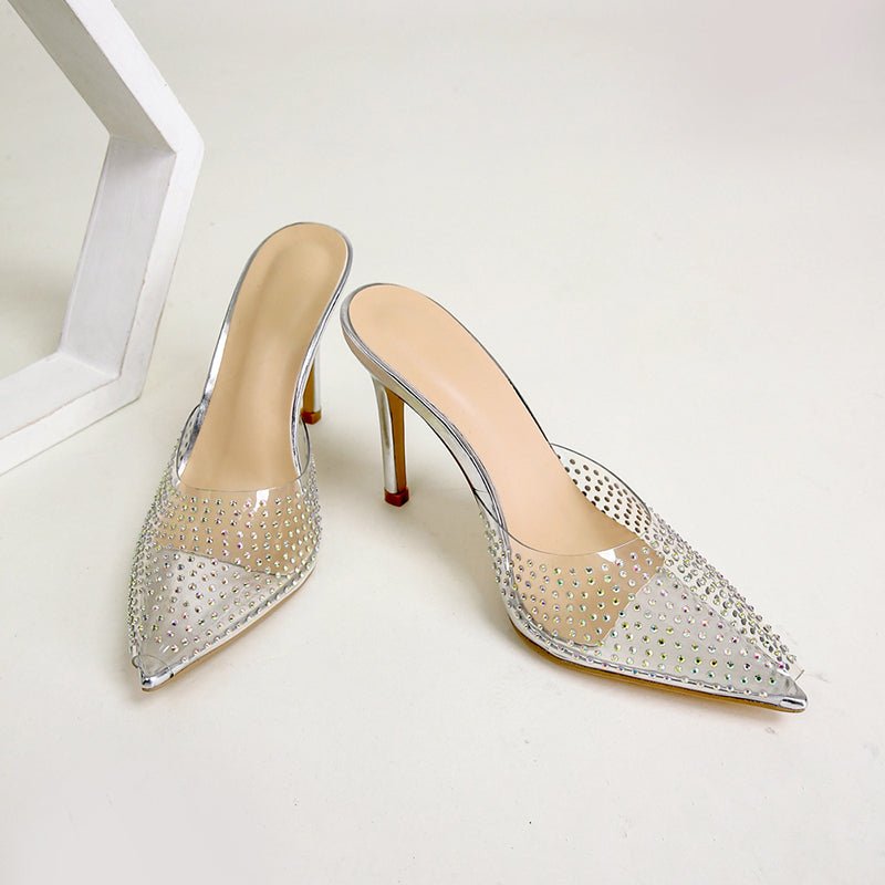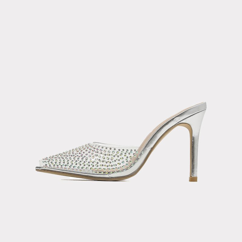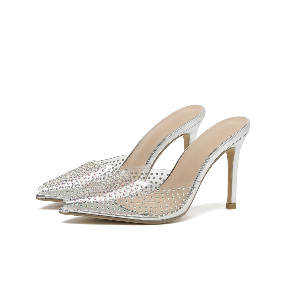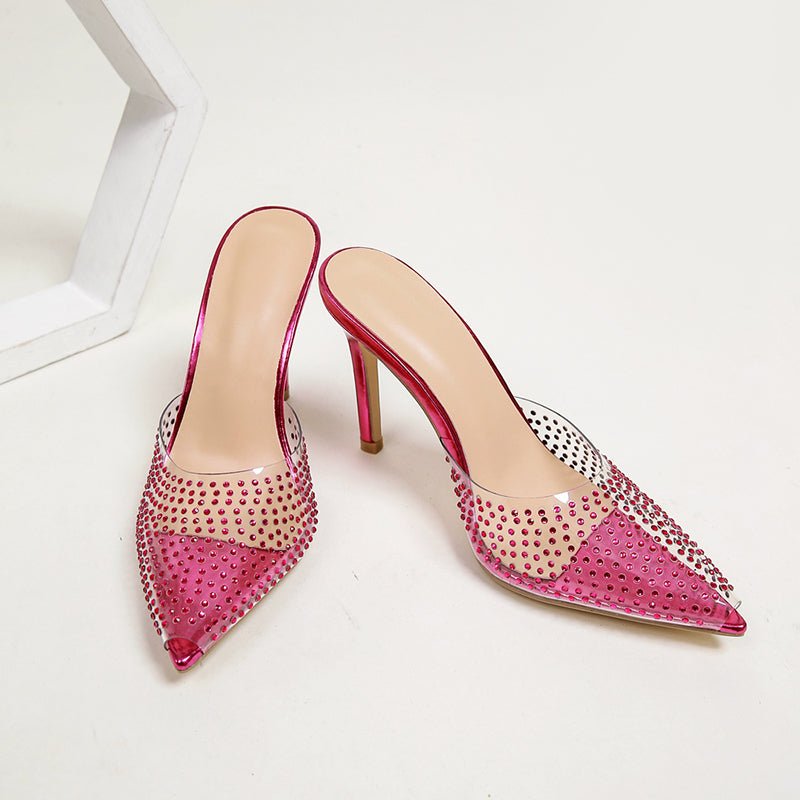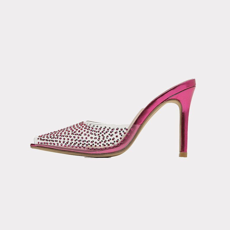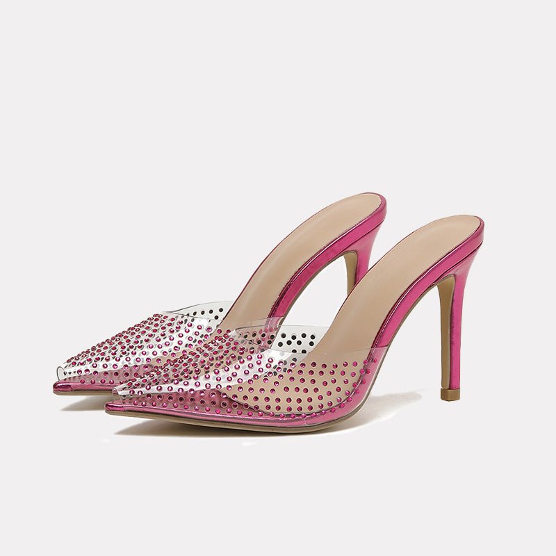 Notice how the crystals on the PVC straps reflect the color of the insoles and heels. Just be ready to be shiny in Lavinder Mules.