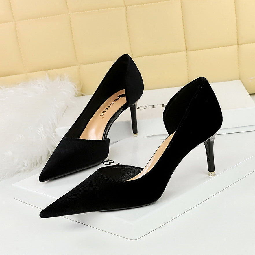 Popular elements: European and American style is simple, sexy and slim, and the side of the banquet is hollowed out, and the west velvet thickened suede high-heeled shoes are light and luxurious.