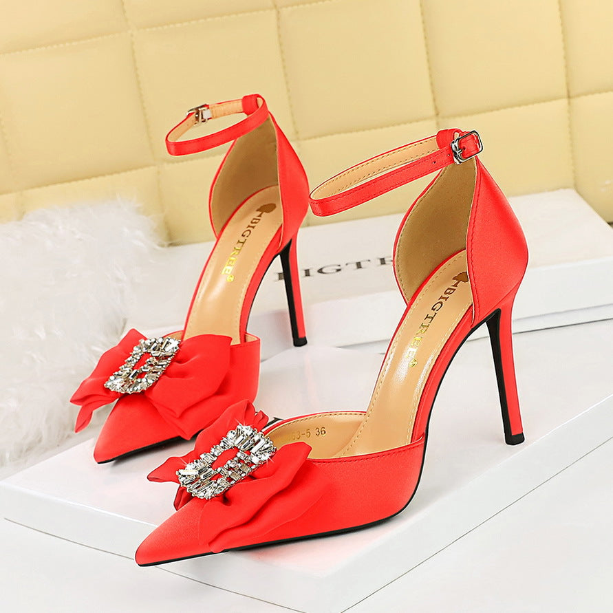 Popular elements: Korean fashion hollow word with rhinestone buckle bow satin shallow banquet wedding shoes