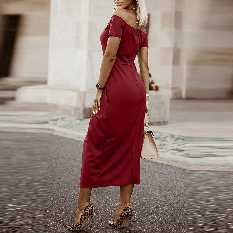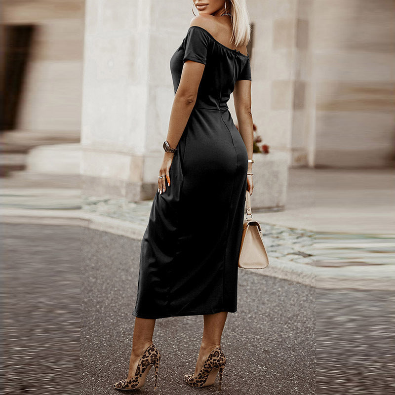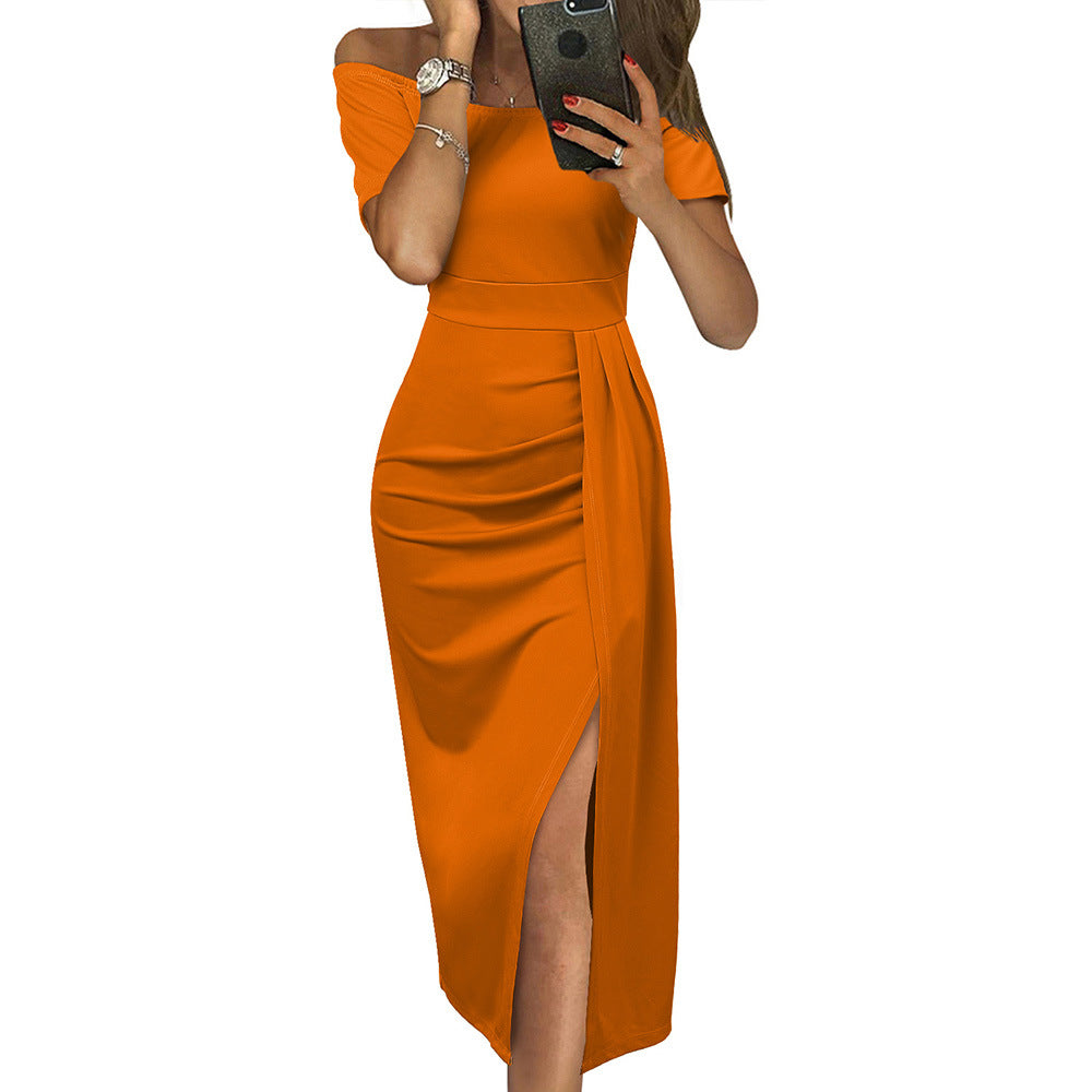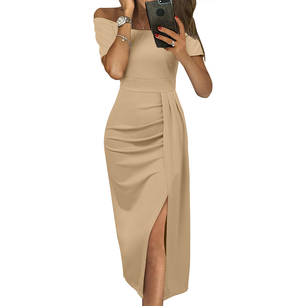 Shi Ying solid color pleated waistband slimming evening dress for Europe and America, slim fitting and sexy one line neckline slit long skirt for women white dress