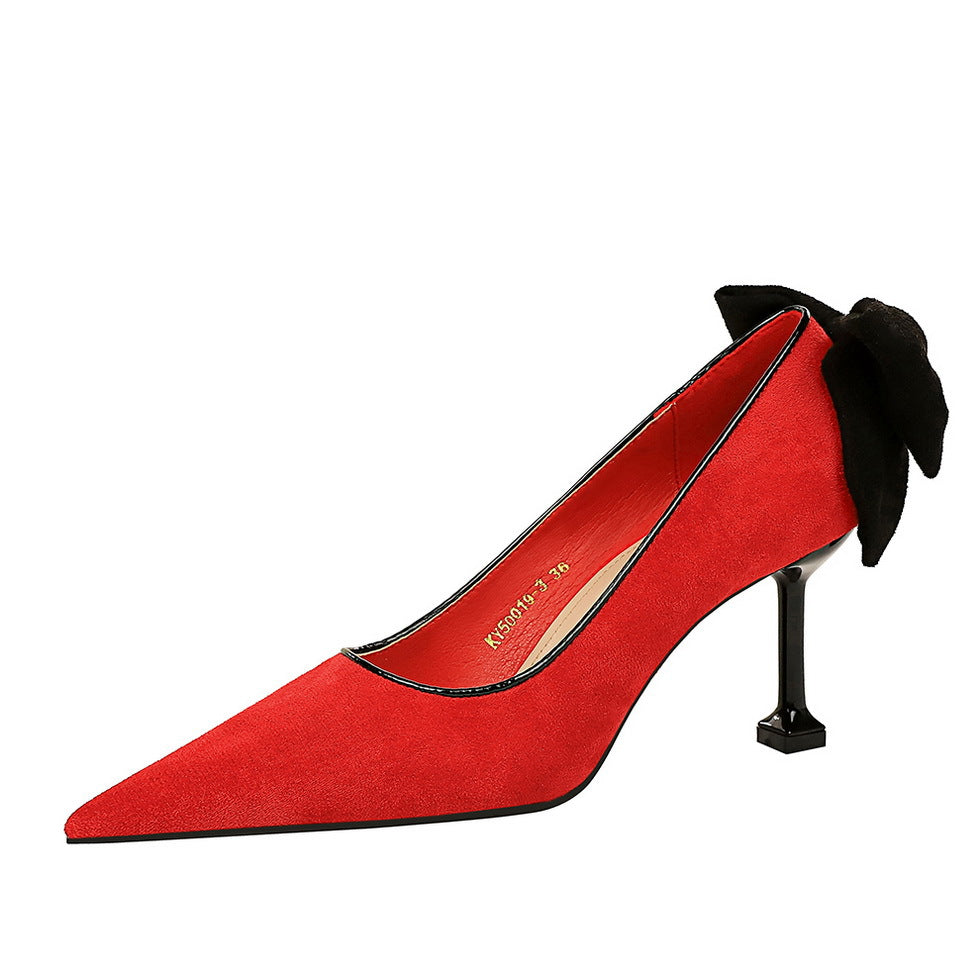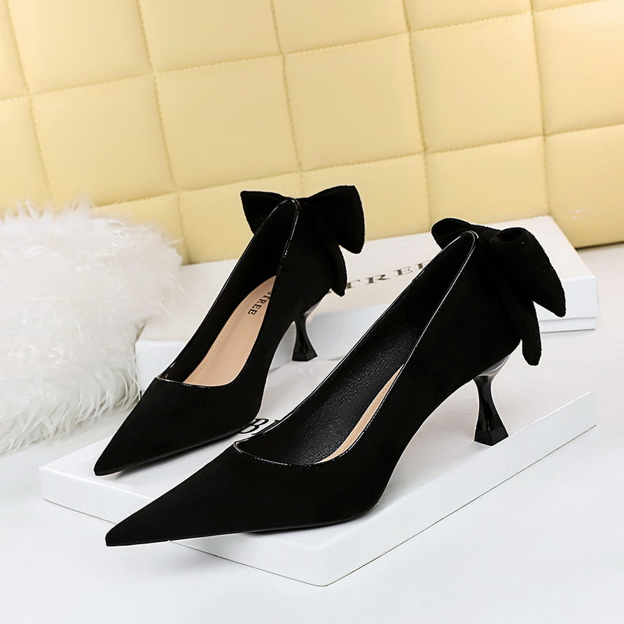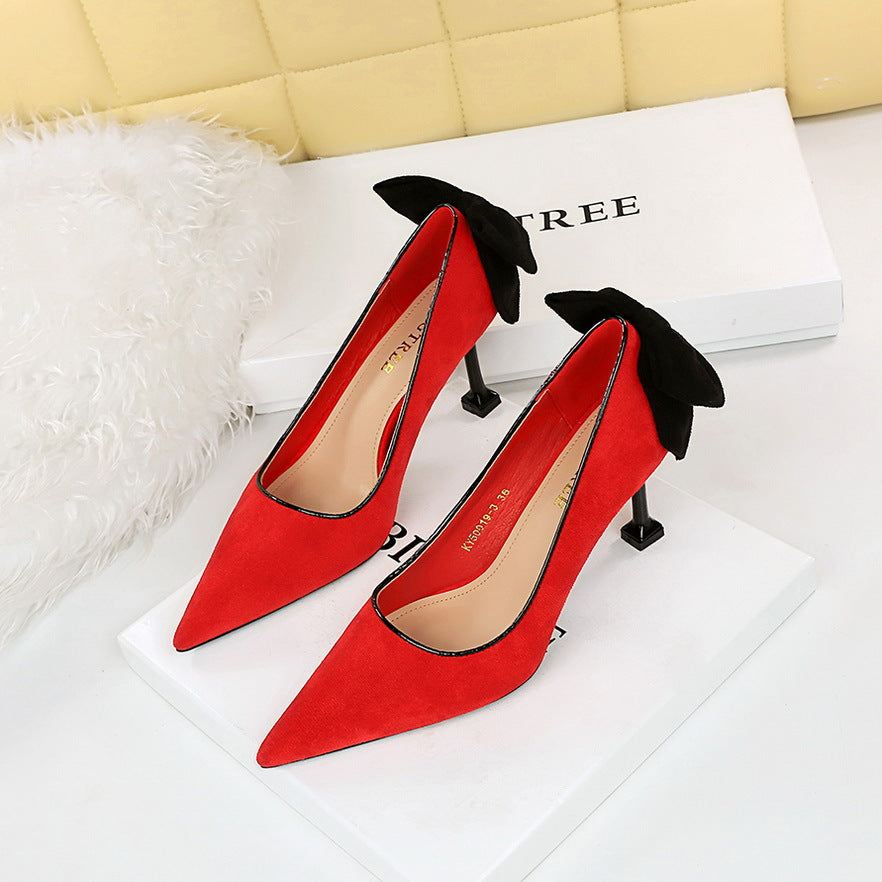 Sweet Beauty Shoes with Thin Heels, Suede, Shallow Mouth, Pointed Toe, Colored Bow Tie