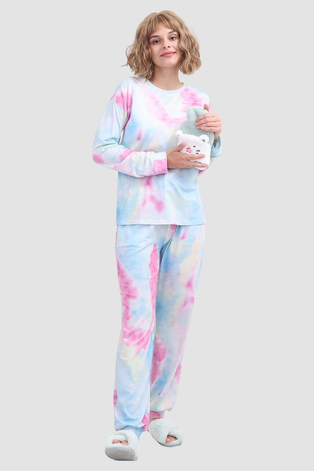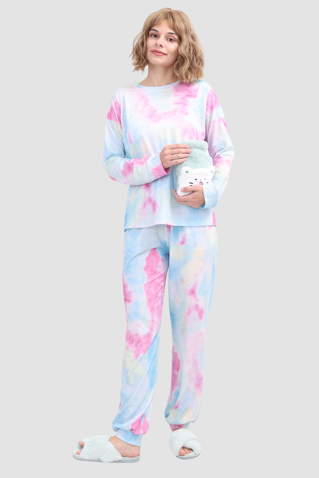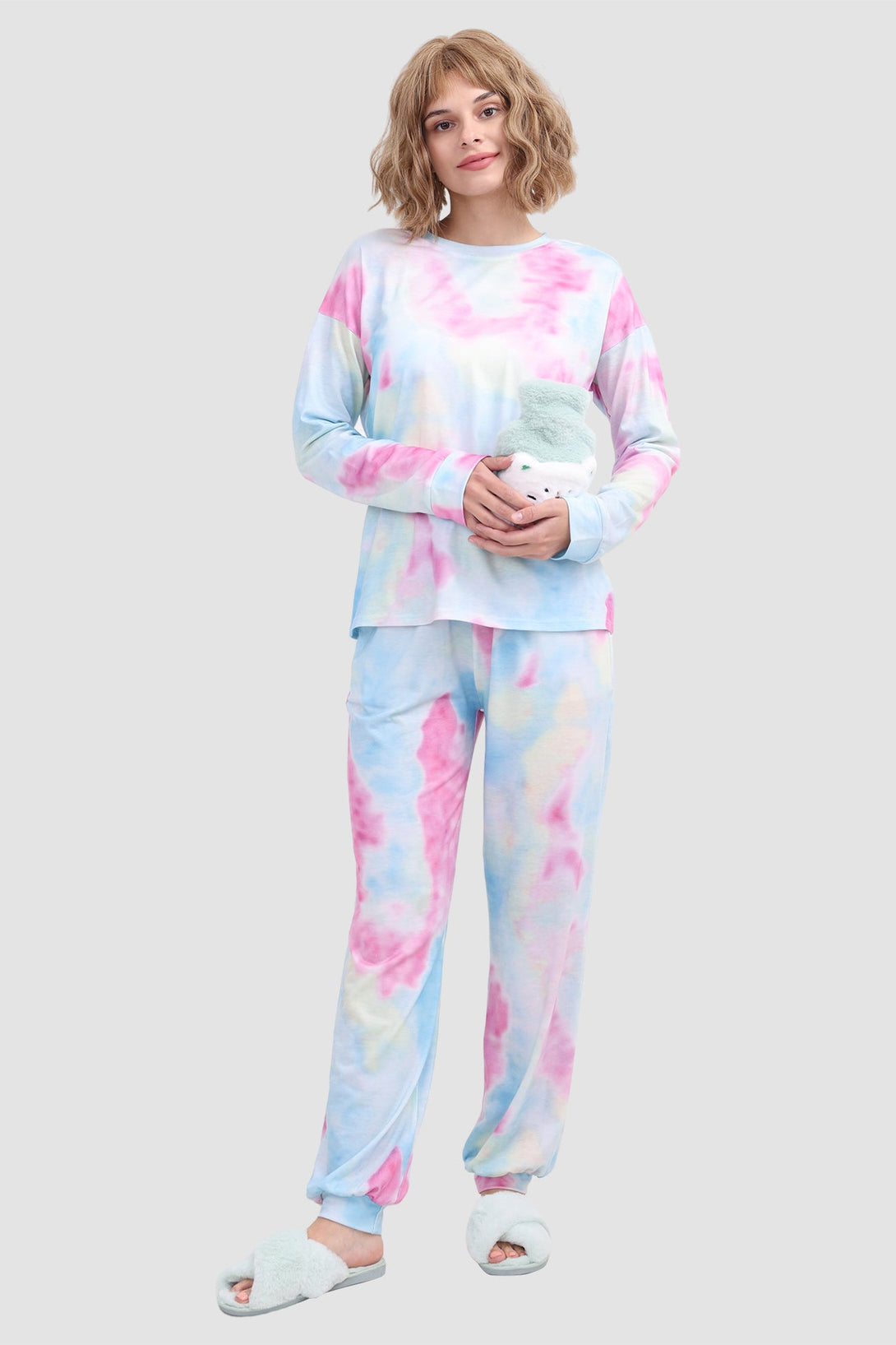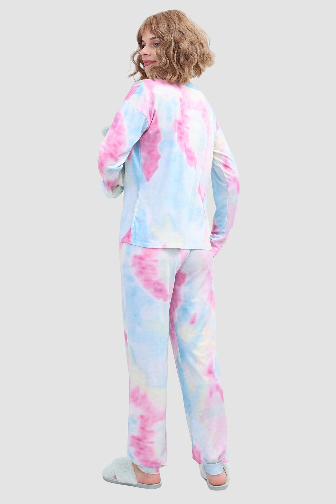 Stylish women's tie - dye loungewear set. Fit true to size. Round neck, long sleeve, ribbed cuffs. Elastic waist & ankles, side pockets. Soft fabric, perfect for cozy days at home. Ideal tie - dye pajamas for comfort.