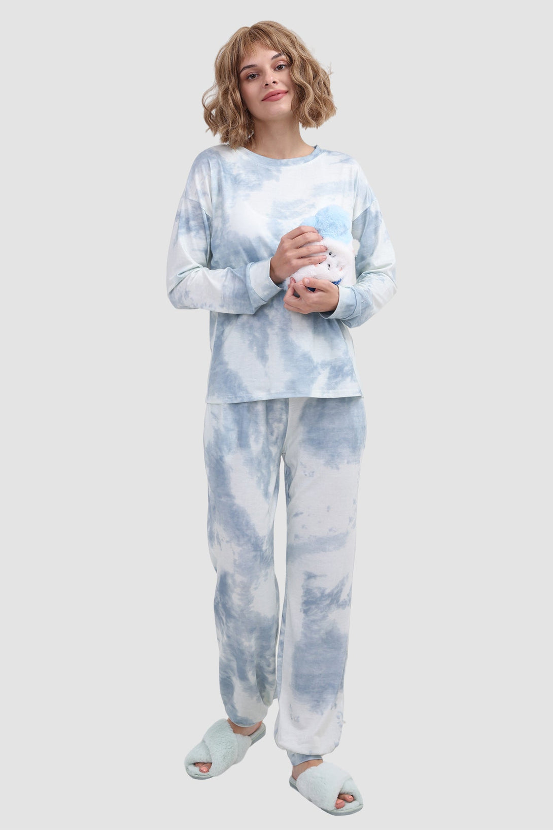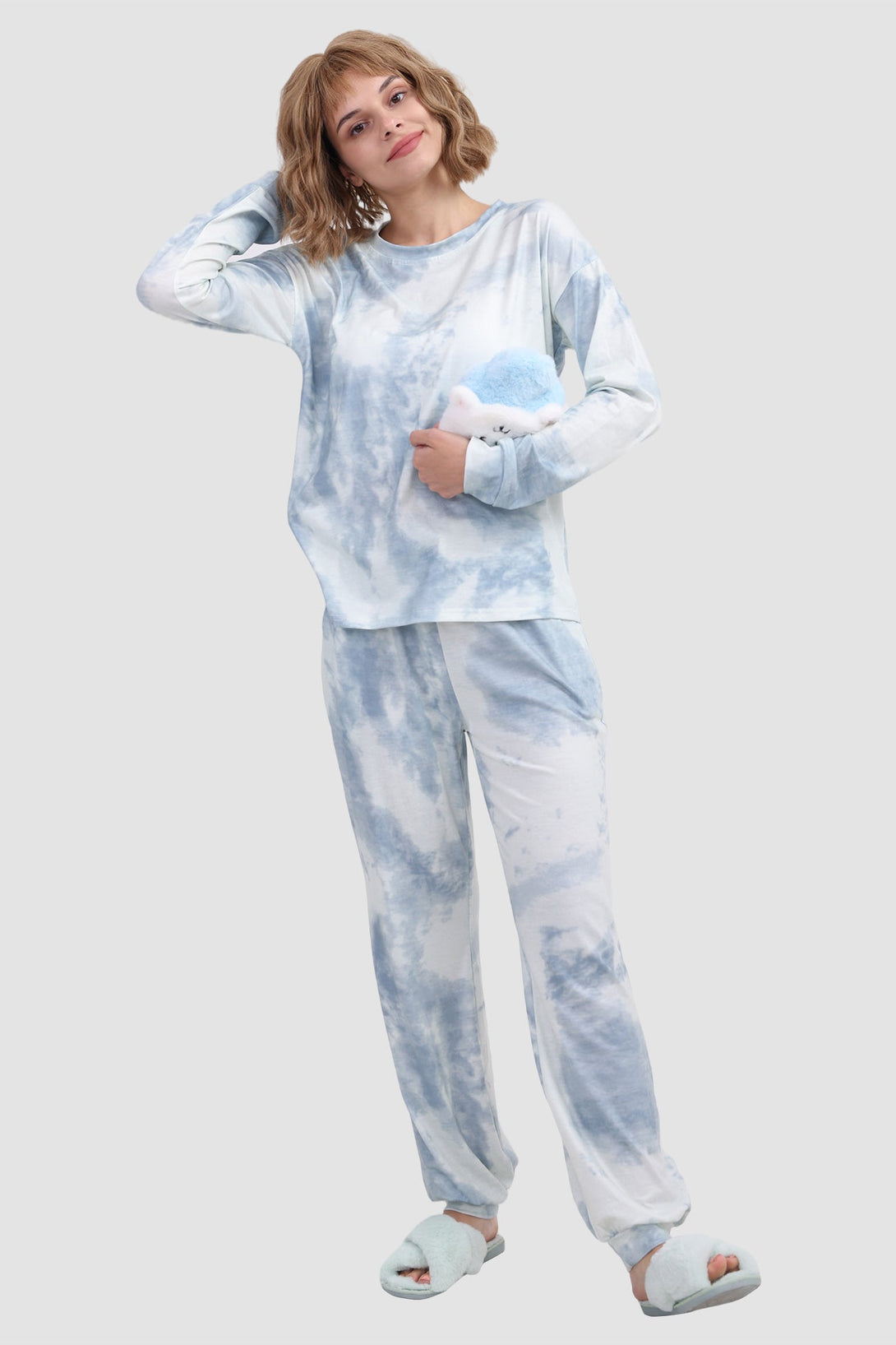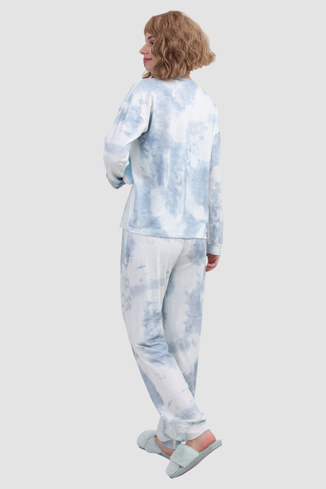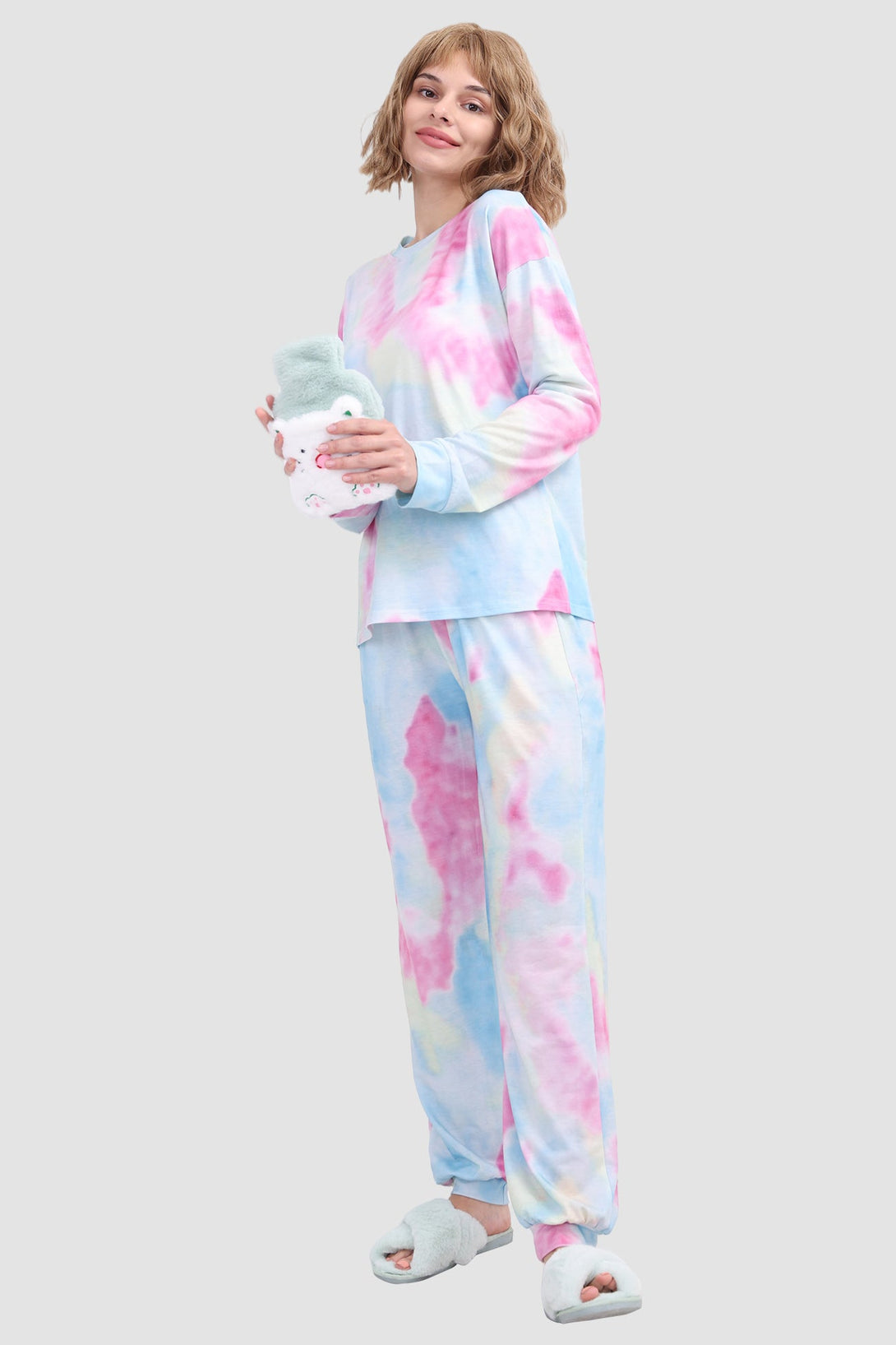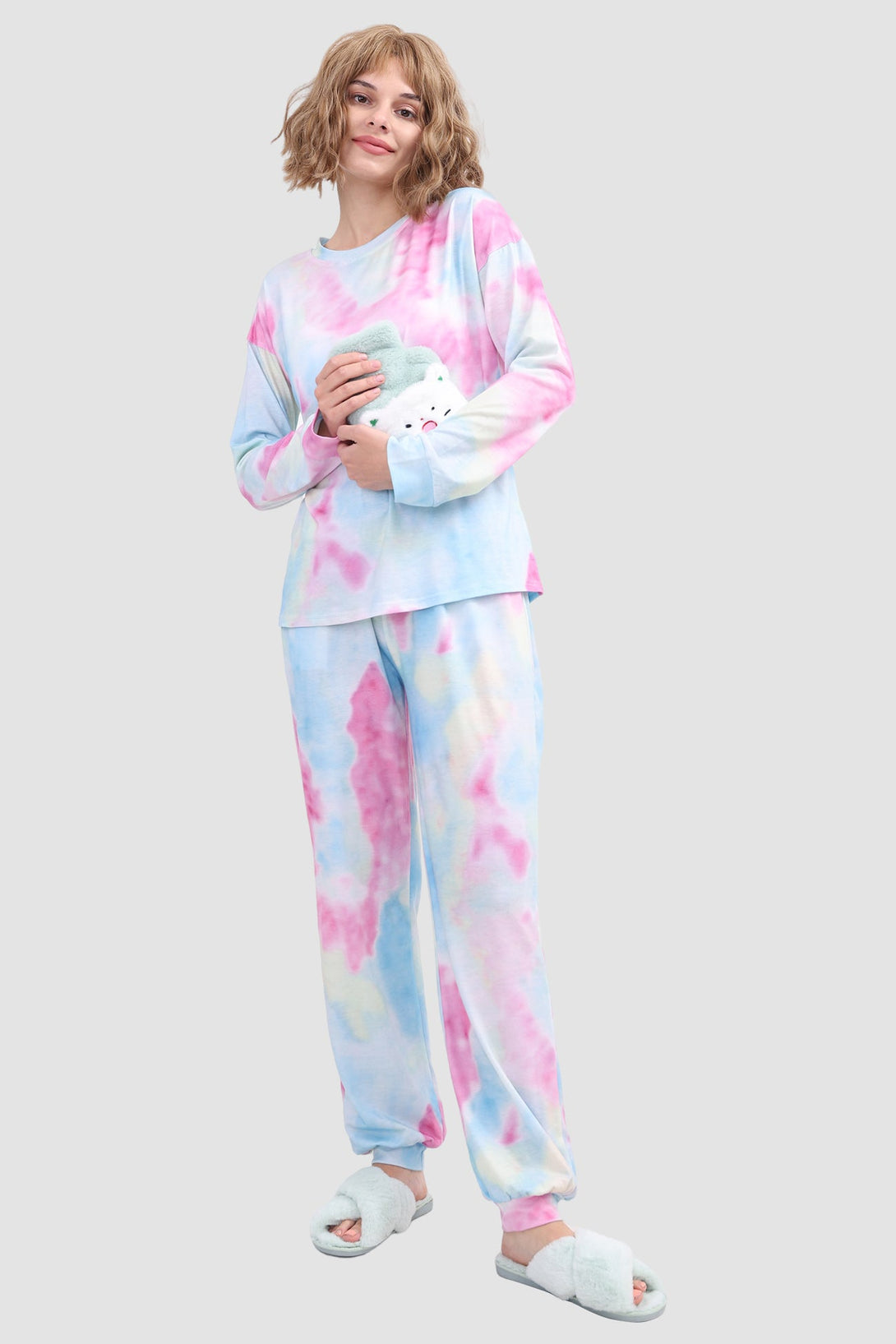 Stylish women's tie - dye loungewear set. Fit true to size. Round neck, long sleeve, ribbed cuffs. Elastic waist & ankles, side pockets. Soft fabric, perfect for cozy days at home. Ideal tie - dye pajamas for comfort.