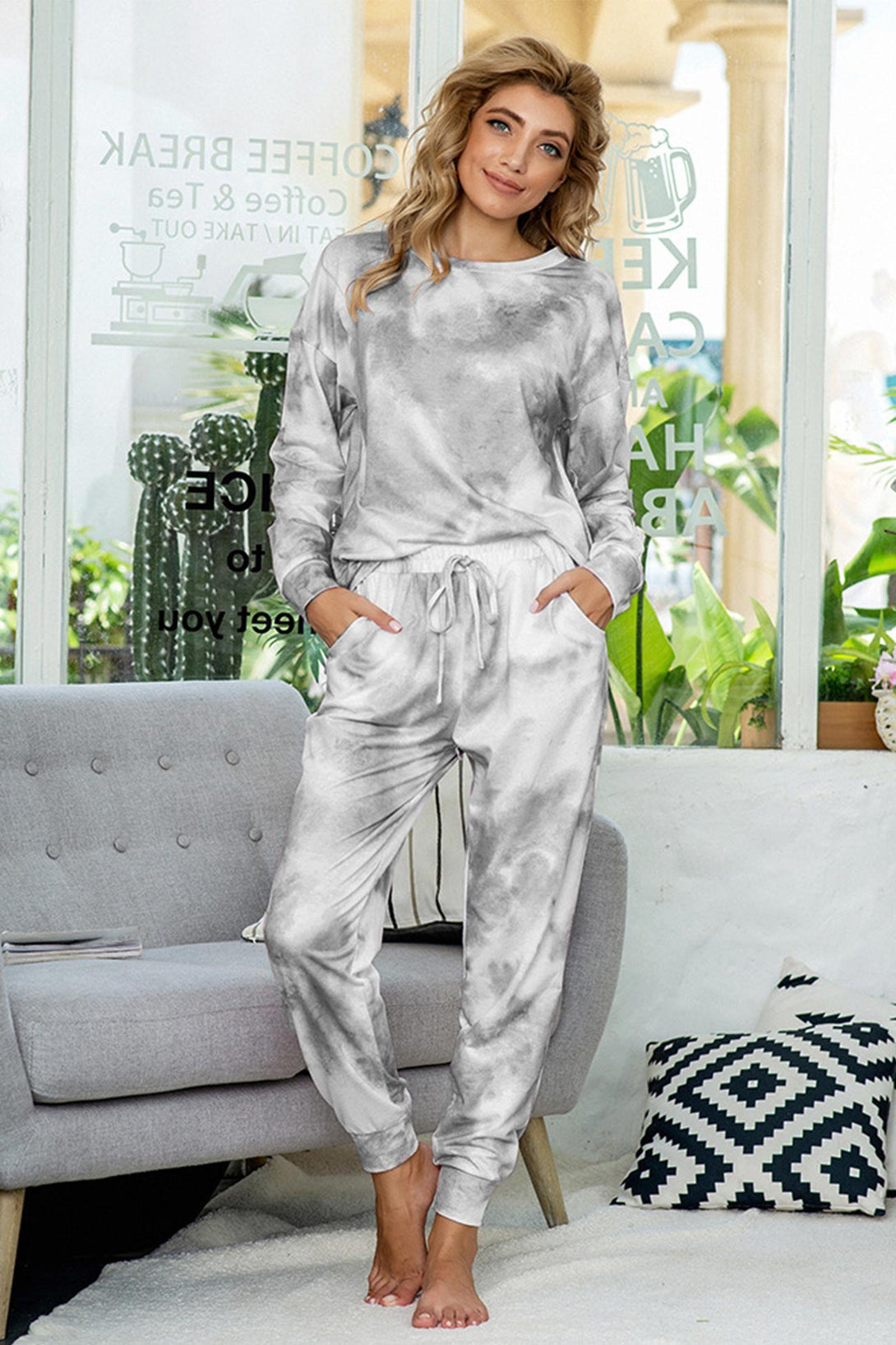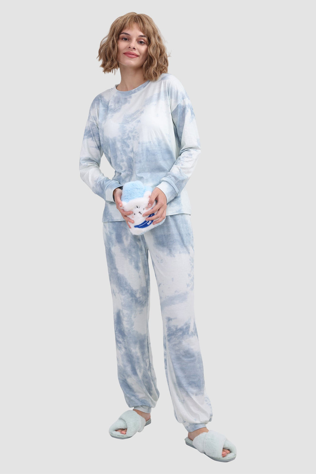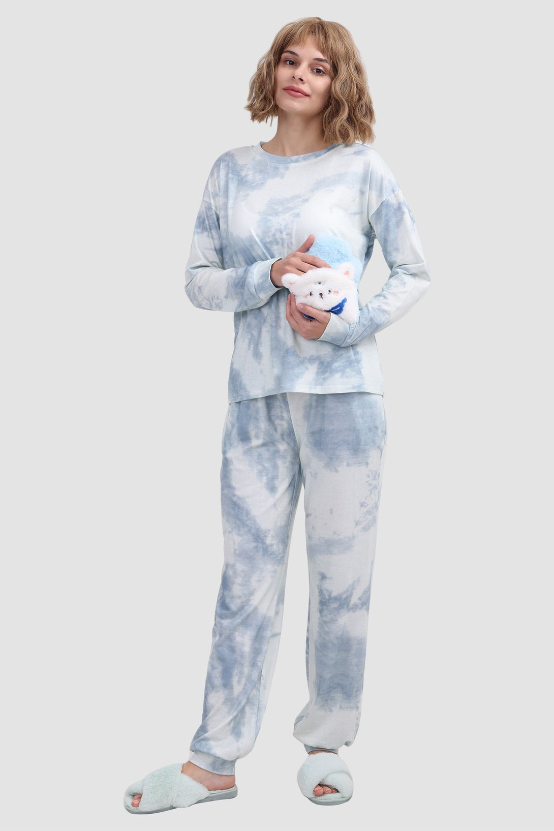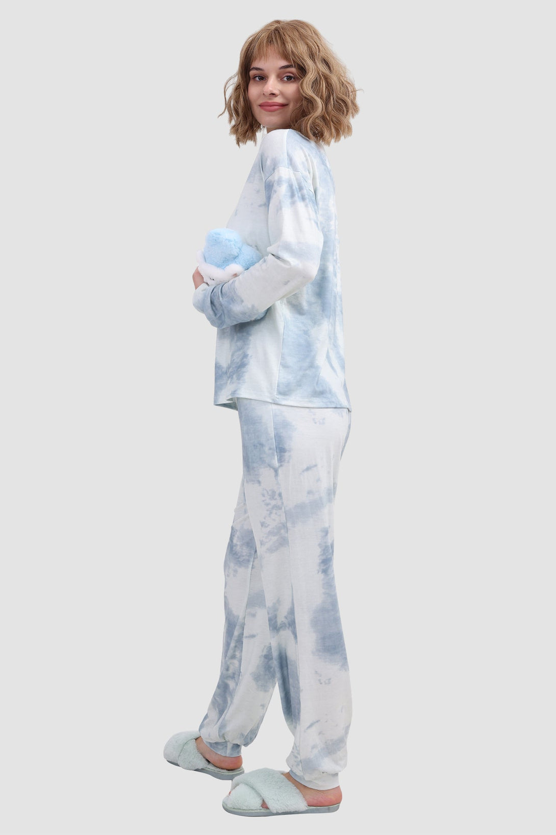 Stylish women's tie - dye loungewear set. Fit true to size. Round neck, long sleeve, ribbed cuffs. Elastic waist & ankles, side pockets. Soft fabric, perfect for cozy days at home. Ideal tie - dye pajamas for comfort.