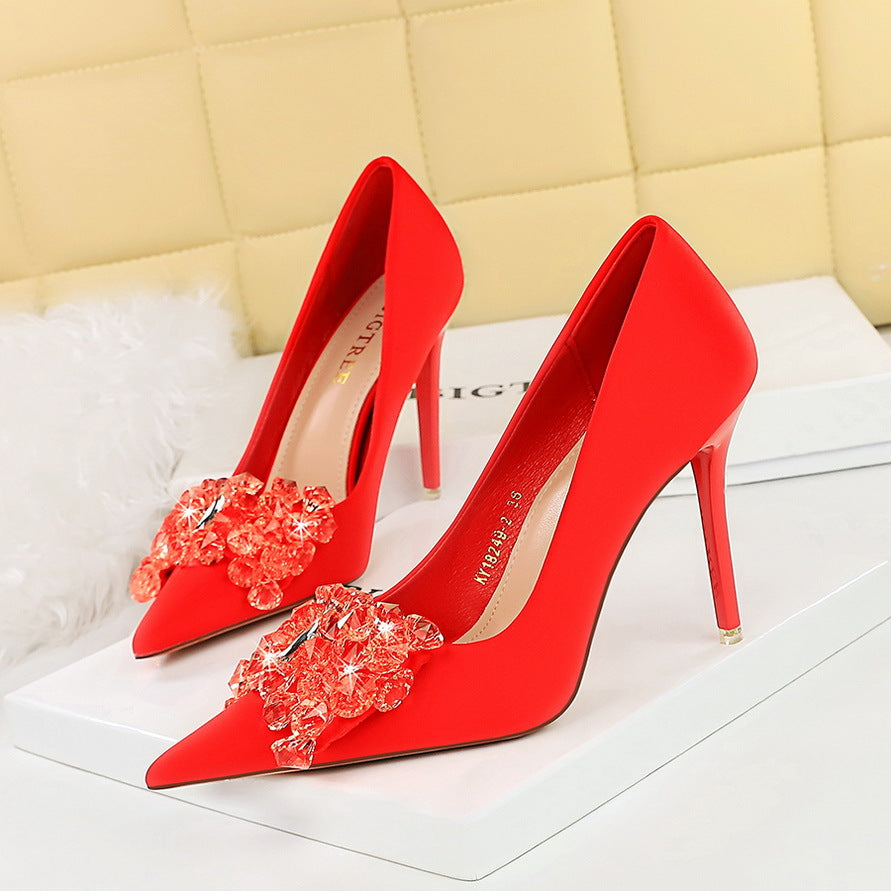 Popular elements: European and American style, fashion, banquet, satin, wedding shoes, super high heels, high heels, gemstone bows