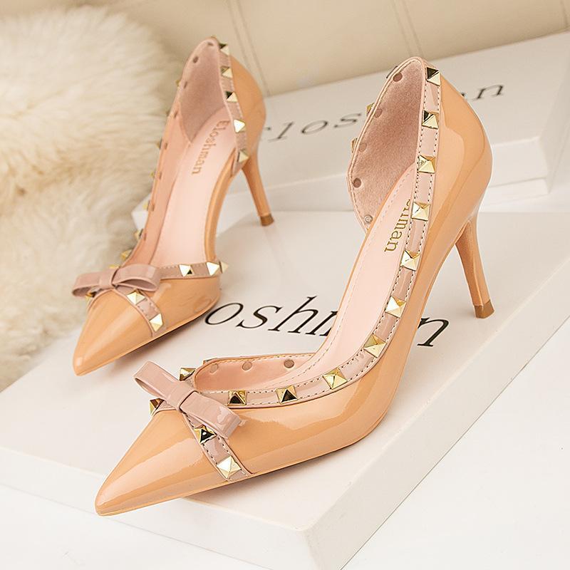 Womens Fashion Stiletto Bowknot Closed Toe Side Cutout With Rivet Party Bridal Shoes