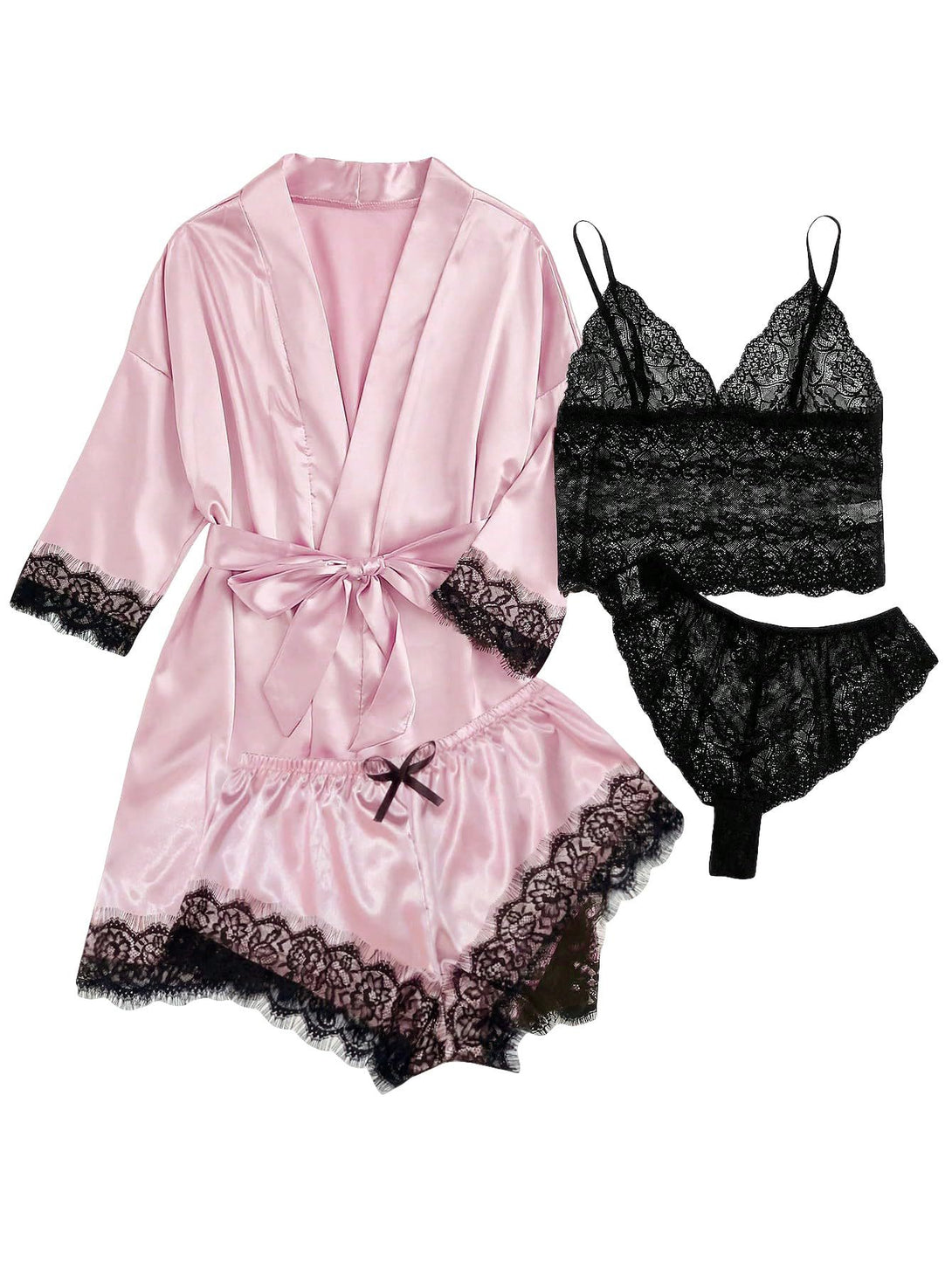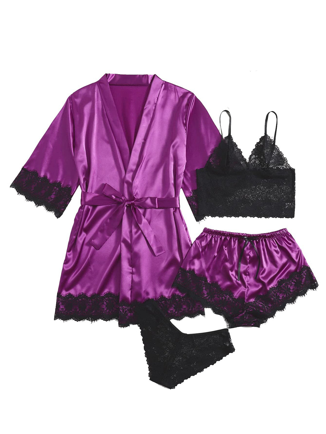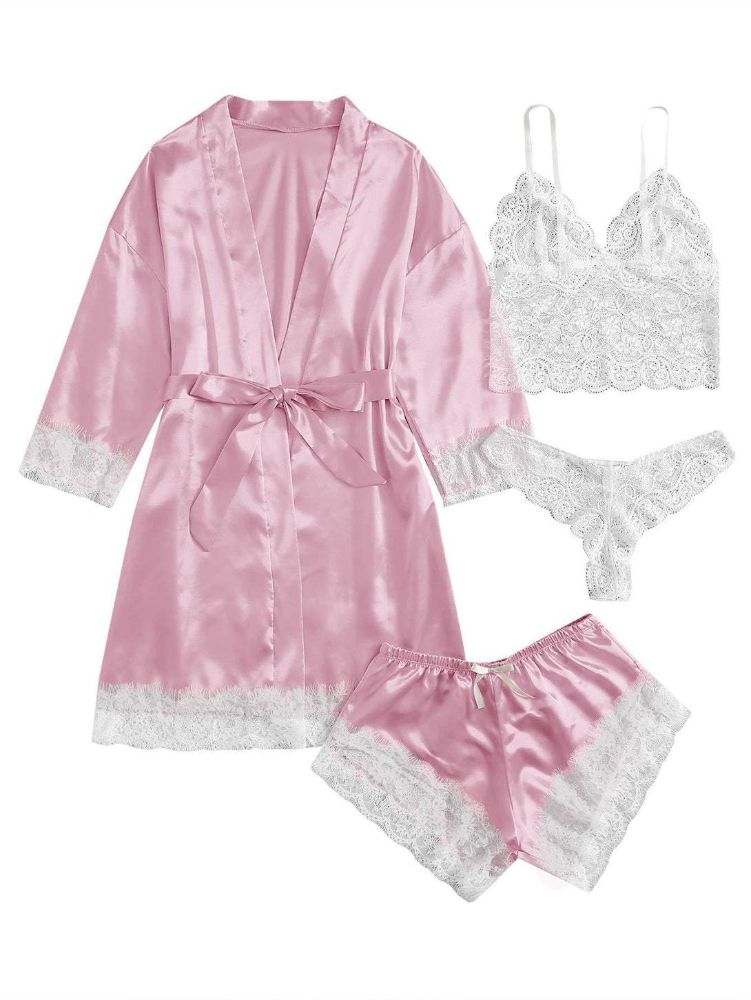 - Lingerie Set: This 4-piece pajama and robe set includes a sexy lace lingerie set (briefs and adjustable strap sling vest), satin shorts, silk lace robe with detachable belt, soft and comfortable pajama set for a relaxing day or night