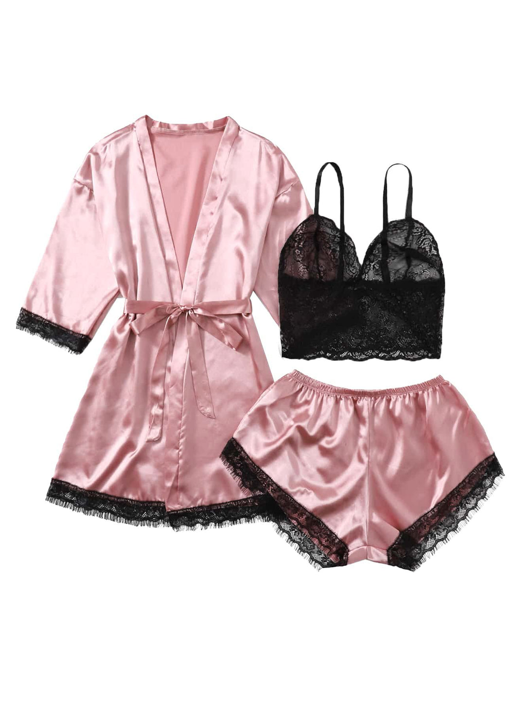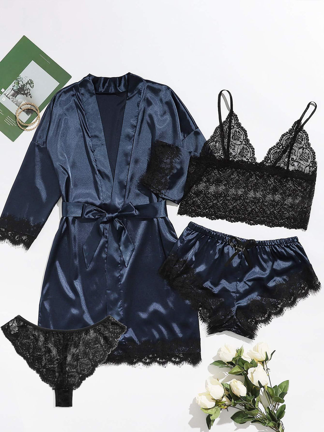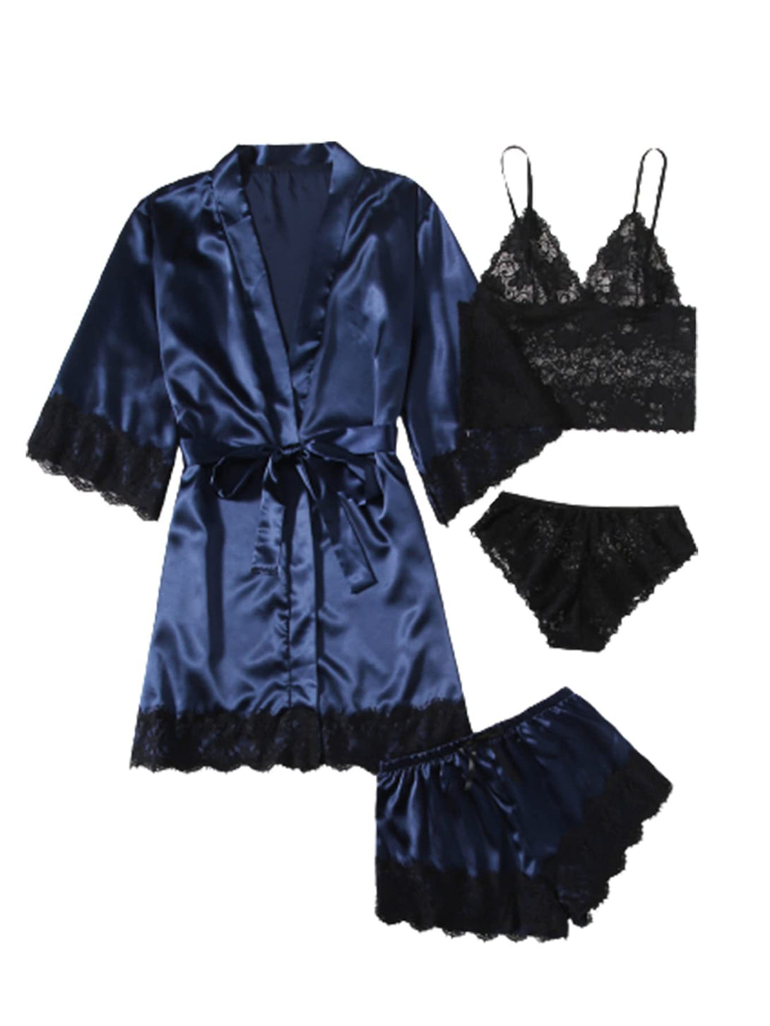 - Lingerie Set: This 4-piece pajama and robe set includes a sexy lace lingerie set (briefs and adjustable strap sling vest), satin shorts, silk lace robe with detachable belt, soft and comfortable pajama set for a relaxing day or night