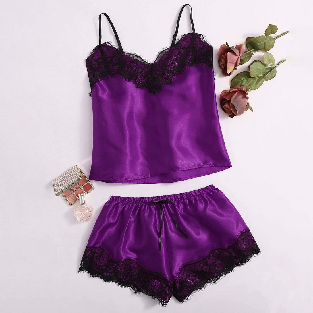 Women's Satin Pajama cami Set Silky Lace Nightwear 2 Piece Lingerie Short Sleepwear